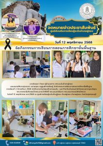 มอบหมายให้นางปุณณภา นรานฤดม ครูศูนย์การเรียนรู้ จัดกิจกรรมการเรียนการสอนการศึกษาขั้นพื้นฐาน ภาคเรียนที่ 2 ปีการศึกษา 2568 นักศึกษาระดับมัธยมศึกษาตอนต้น และทำโบว์ริบบิ้นน้อมรำลึกในพระมหากรุณาธิคุณพระราชกรณียกิจสมเด็จพระนางเจ้าสิริกิติ์ พระบรมราชินีนาถ พระบรมราชชนนีพันปีหลวง (วันพุธ) ในวันที่ 12 พฤศจิกายน พ.ศ.2568