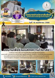 นางชิดชนก กังแฮ ผู้อำนวยการศูนย์ส่งเสริมการเรียนรู้ระดับอำเภออู่ทอง มอบหมายให้ นายกฤษดากร เหล่าประเสริฐ ครูศูนย์การเรียนรู้ นำนักศึกษา ระดับชั้นมัธยมศึกษาตอนปลาย ลงนามเพื่อร่วมแสดงความไว้อาลัย ในวันที่ 18 พ.ย 2568 ณ ห้องสมุดประชาชนอำเภออู่ทอง หมู่ 6 ตำบลอู่ทอง อำเภออู่ทอง จังหวัดสุพรรณบุรี ผู้ลงนามถวายความอาลัยจำนวน 22 คน