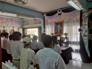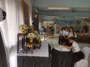 นายกฤษดากร เหล่าประเสริฐ ครูศูนย์การเรียนรู้ นำนักศึกษา ระดับชั้นมัธยมศึกษาตอนปลาย ลงนามเพื่อร่วมแสดงความไว้อาลัย