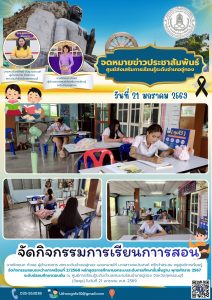 มอบหมายให้ นางสาวสมประสงค์ ศรีหว้าสระสม ครูศูนย์การเรียนรู้ จัดกิจกรรมสอบระหว่างภาคเรียนที่2/2568 หลักสูตรการศึกษานอกระบบระดับการศึกษาขั้นพื้นฐาน พุทธศักราช 2567 นระดับมัธยมศึกษาตอนต้น ณ ศูนย์การเรียนรู้ระดับตำบลสระยายโสมอำเภออู่ทอง จังหวัดสุพรรณบุรี (วันพุธ) ในวันที่ 21 มกราคม พ.ศ. 2569