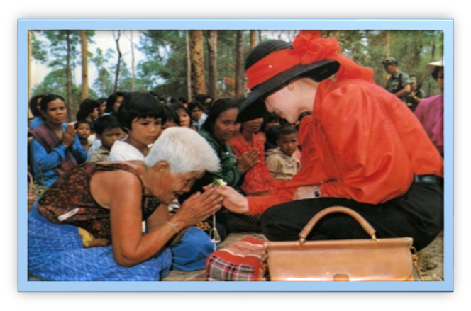 นอกจากปวงชนชาวไทยแล้ว น้ำพระราชหฤทัยในสมเด็จพระบรมราชชนนีพันปีหลวงยังแผ่ไพศาลถึงผู้อพยพลี้ภัยจำนวนมากดังเหตุการณ์บ้านเขาล้าน จ.ตราด ทรงเยี่ยมผู้ลี้ภัยสงครามชาวกัมพูชา ทรงนำอาหาร ยารักษาโรค และเครื่องนุ่งห่มไปพระราชทานด้วยพระองค์เอง ทรงพระกรุณาโปรดเกล้าฯ ให้สภากาชาดไทยไปให้ความร่วมมือกับกาชาดสากลในการช่วยเหลือผู้อพยพ และพระราชทานครูเข้าไปสอนวิชาชีพให้แก่ผู้อพยพ กิจการดังกล่าวได้ดำเนินมาอย่างต่อเนื่องเป็นเวลานาน ทรงจัดตั้ง มูลนิธิสายใจไทย ช่วยเหลือทหาร ตำรวจ และอาสารับใช้ชาติที่บาดเจ็บ พิการ พัฒนาอาชีพให้ช่วยเหลือตัวเองและมีรายได้เลี้ยงครอบครัว ผลิตภัณฑ์หัตถกรรมจากมูลนิธิสายใจไทยเป็นที่รู้จักและนิยมของคนไทยมาโดยตลอด