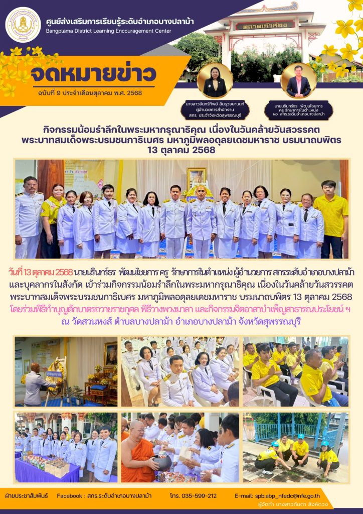 ข่าวกิจกรรม กศน.อำเภอ กิจกรรมน้อมรำลึกในพระมหากรุณาธิคุณ เนื่องในวันคล้ายวันสวรรคต พระบาทสมเด็จพระบรมชนกาธิเบศร มหาภูมิพลอดุลยเดชมหาราช บรมนาถบพิตร 13 ตุลาคม 2568 16/10/202517/10/2025 ศูนย์ส่งเสริมการเรียนรู้อำเภอบางปลาม้า 0 Comments