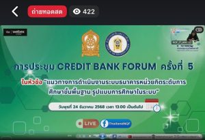วันที่ ๒๔ ธันวาคม ๒๕๖๘ นางสาวจันทร์ทิพย์ สินธุวงษานนท์ ผู้อำนวยการสำนักงานส่งเสริมการเรียนรู้ประจำจังหวัดสุพรรณบุรี มอบหมายให้นางสาวชลธิชา สืบวัฒนพงษกุล ตำแหน่งนักวิชาการศึกษา เข้าร่วมการประชุม ครั้งที่ ๕ Credit Bank Fourum : แนวทางการดำเนินงานระบบธนาคารหน่วยกิตระดับการศึกษาขั้นพื้นฐาน รูปแบบการศึกษาในระบบ ณ โรงแรมศรีอู่ทองแกรนด์ จังหวัดสุพรรณบุรี ผ่านช่องทางระบบออนไลน์การถ่ายทอดสด Facebook Live : Thailand NQF