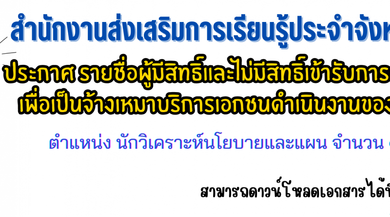 ข่าวกิจกรรม สกร.ระดับอำเภอ ข่าวกิจกรรมสำนักงาน สกร.ประจำจังหวัดสุพรรณบุรี ข่าวประชาสัมพันธ์/ประกาศ ประกาศ รายชื่อผู้มีสิทธิ์และไม่มีสิทธิ์เข้ารับการคัดเลือกบุคคลเพื่อเป็นจ้างเหมาบริการเอกชนดำเนินงานของส่วนราชการ กุมภาพันธ์ 19, 2026 suwat malinin 0 Comments สำนักงานส่งเสริมการเรียนรู้ประจำจังหวัดสุพรรณบุรี ประกาศ รายชื่อผู้มีสิทธิ์และไม่มีสิทธิ์เข้ารับการคัดเลือกบุคคลเพื่อเป็นจ้างเหมาบริการเอกชนดำเนินงานของส่วนราชการ ตำแหน่ง นักวิเคราะห์นโยบายและแผน จำนวน ๑ อัตรา