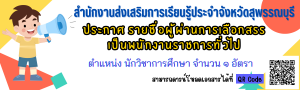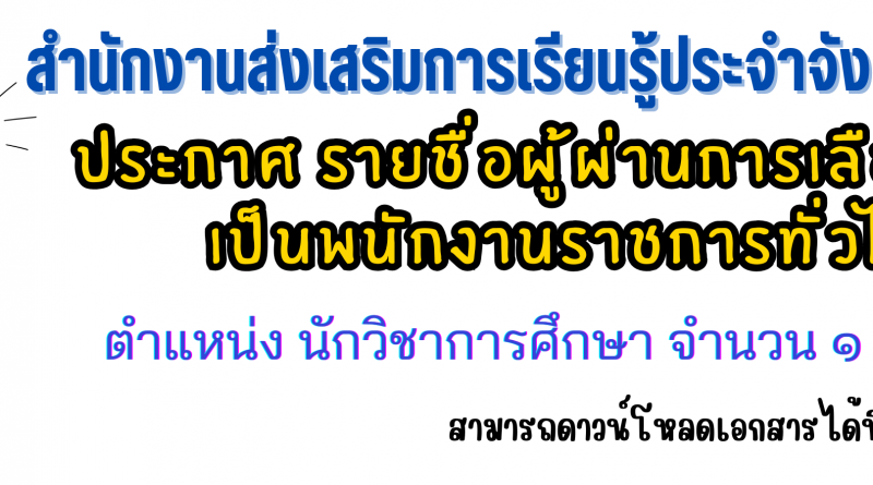 ข่าวกิจกรรมสำนักงาน สกร.ประจำจังหวัดสุพรรณบุรี ข่าวประชาสัมพันธ์/ประกาศ ประกาศ รายชื่อผู้ผ่านการเลือกสรรเป็นพนักงานราชการทั่วไป เมษายน 28, 2026 suwat malinin 0 Comments สำนักงานส่งเสริมการเรียนรู้ประจำจังหวัดสุพรรณบุรี ประกาศ รายชื่อผู้ผ่านการเลือกสรรเป็นพนักงานราชการทั่วไป ตำแหน่ง นักวิชาการศึกษา จำนวน ๑ อัตรา สามารถดาวน์โหลดได้ที่