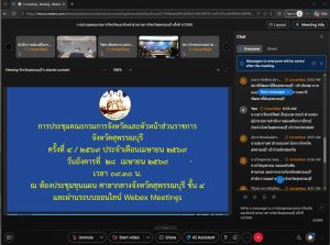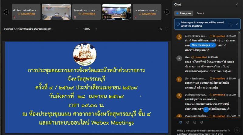 วันที่ ๒๘ เมษายน ๒๕๖๙ นางสาวจันทร์ทิพย์ สินธุวงษานนท์ ผู้อำนวยการสำนักงานส่งเสริมการเรียนรู้ประจำจังหวัดสุพรรณบุรี เข้าร่วมการประชุมคณะกรมการจังหวัดและหัวหน้าส่วนราชการจังหวัดสุพรรณบุรี ครั้งที่ ๔/๒๕๖๙ ผ่านช่องทางระบบออนไลน์โปรแกรม Webex Meeting โดยมีนายณัฐพงษ์ สงวนจิตร ผู้ว่าราชการจังหวัดสุพรรณบุรี เป็นประธาน